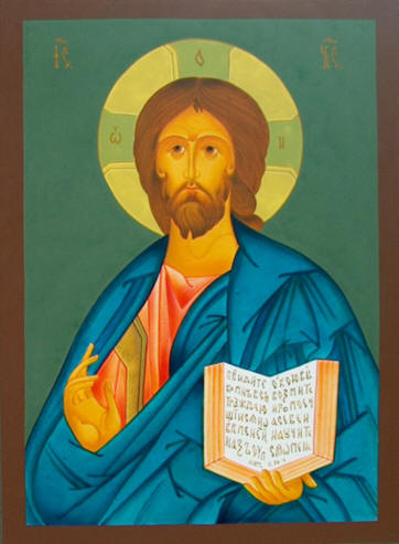 Christusikone - Christus Pantokrator (griech. Allherrscher, russ. Spas Vsederjitel) Diese Ikone ist die häufigste Darstellung von Jesus Christus. Der Sohn Gottes ist hier halbfigurig, frontal zum Beschauer zu sehen. Die Rechte hat er zum Segen erhoben, sie ist