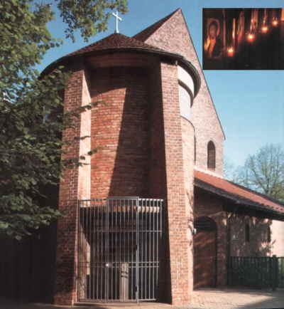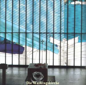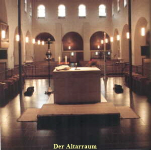 Kirche schnell feststellen, daß überall Über- raschungen warten. Der gesamte Kirchen- komplex, incl. Friedhof, hat ein theologi- sches Konzept. Dieses Konzept ist auf dem Stein in der Mitte des