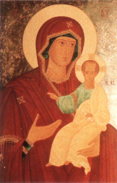 Gnade. Sie ist voll der Gnade. Sie ist Wegleiterin. Ihre Hand weist auf Jesus, den Weg, die Wahrheit und das Leben. geschrieben von A. Saweljew