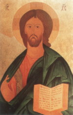 Sein purpurnes Gewand, das Gewand der Gottheit, ist umhüllt vom blaugrünen Gewand der Menschheit. Gott wurde in Jesus von Nazareth Mensch.